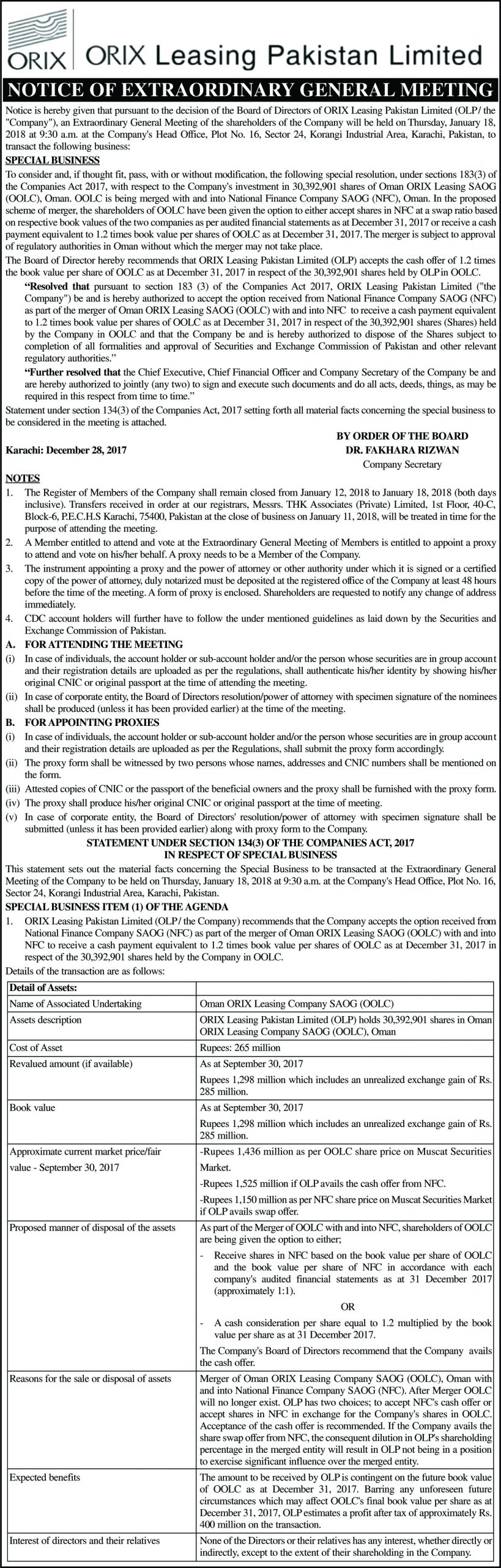 Please note that as per the requirement of the Income Tax Ordinance, 2001, OLP Financial Services Limited (the Company), a responsible taxpayer is legally required to provide the FBR complete details of dividends paid to its shareholder and tax withheld thereon.